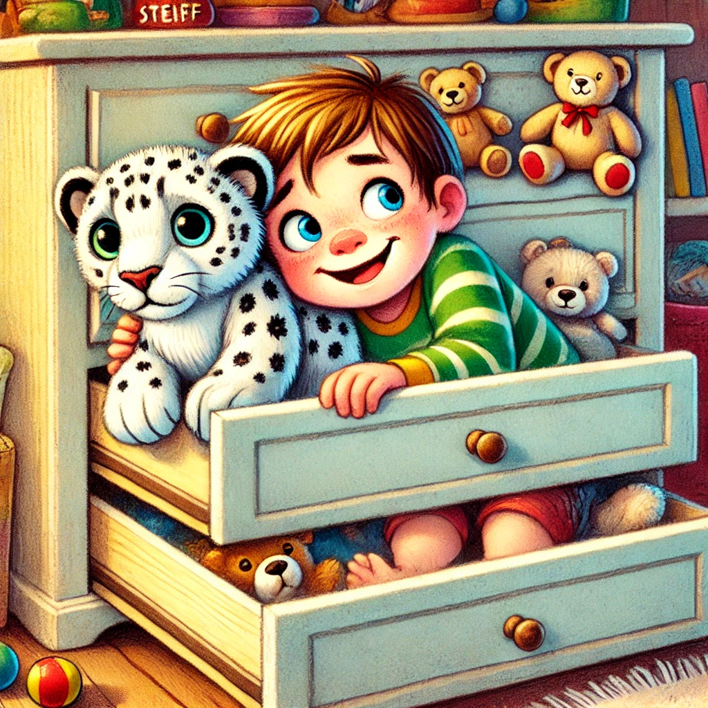 Als erstes räumt er ganz leise die unterste große Schublade von seiner Spielzeugtruhe aus. Dann holt er seine Hosen, Pullover und Shirts aus seinem Schrank. Die breitet er in seiner Schublade aus. Zum Schluss holt er Pardi. Mit ihm klettert er in die Truhe. So ganz allein traut er sich nicht.